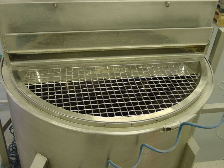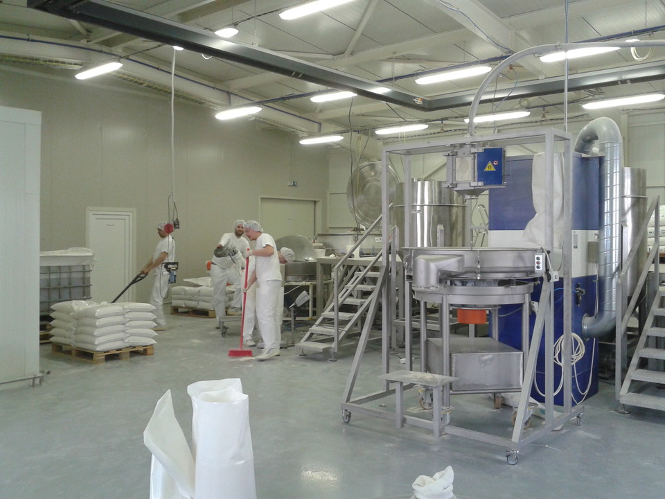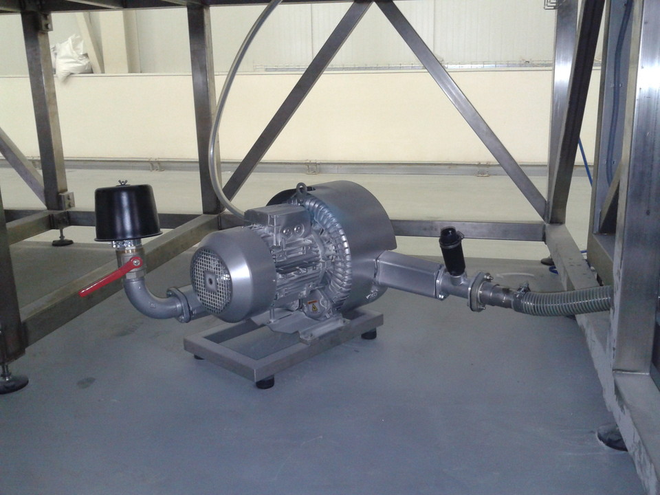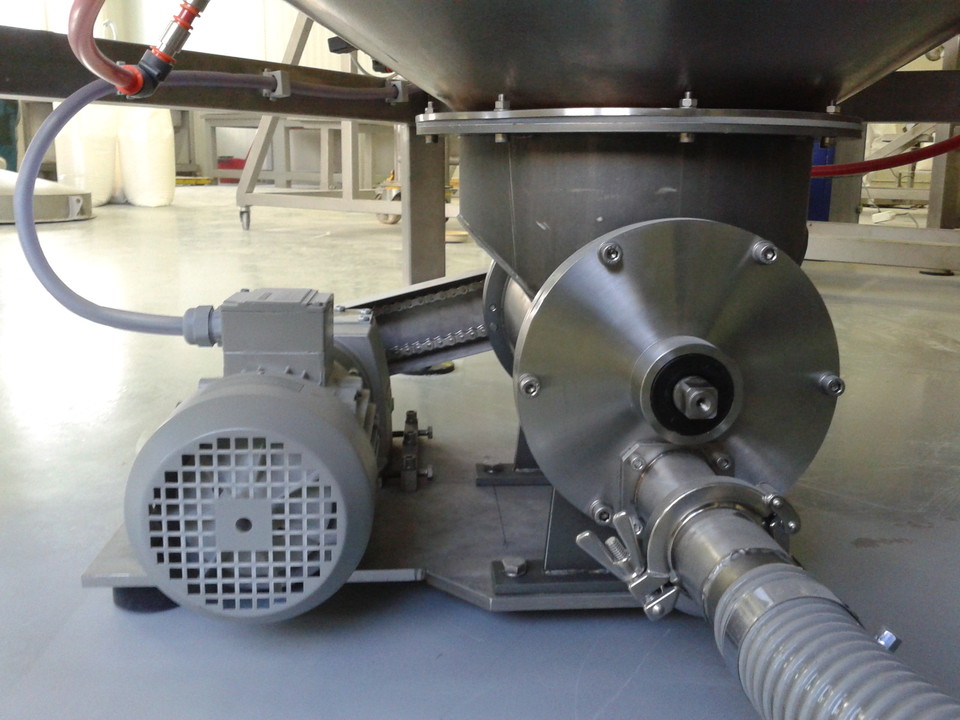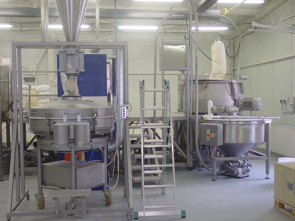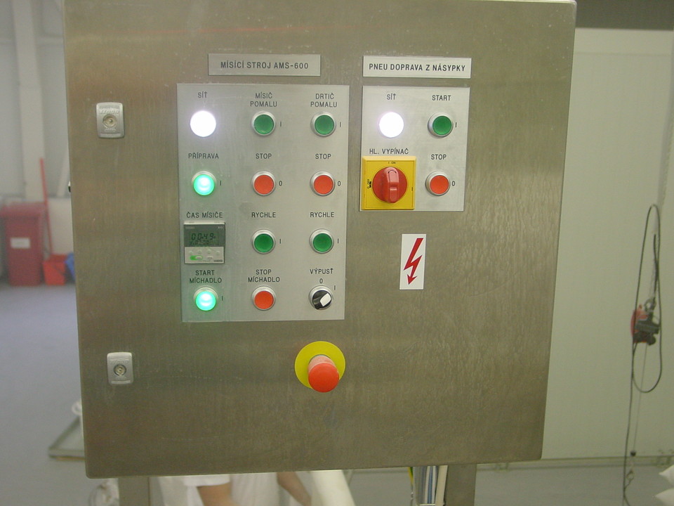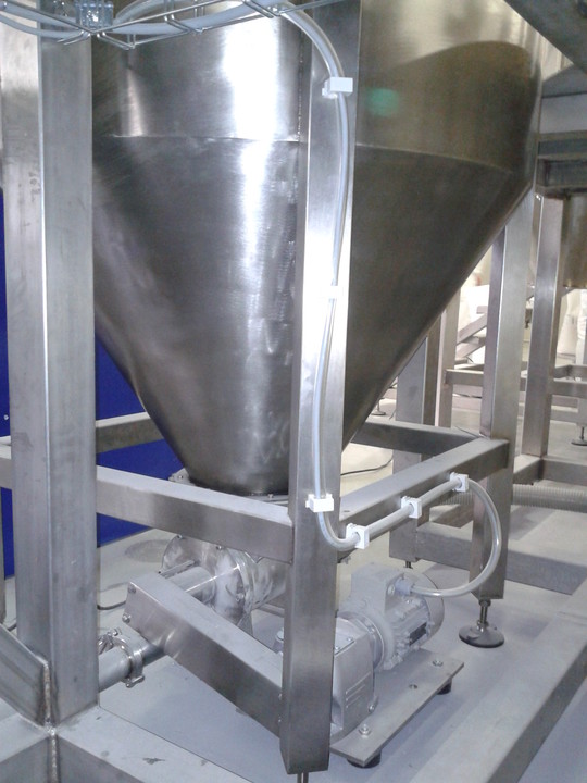 Obsluha nyní nadávkuje do příslušných násypek předepsanou vsázku. Po jejím nadávkování, pokud je příslušná AMS již vyprázdněna, zapne start přepravy. Dávkovací turnikety dávkují připravenou surovinu z násypky do průchozí komory turniketu, kde tlakem vzduchu, vytvořeným dmychadlem, je hmota průběžně dávkována do příslušné AMS. Pneumatické potrubí je nerezové potrubí o rozměru 76,1x1,6 mm. Nerezové trubky jsou opatřeny hrdly Clamp a tyto jsou pak spojeny v jeden celek objímkami Clamp. Celý systém je jednoduše rozebíratelný (spojení clamp), snadno čistitelný a sanitovatelný. Dávkovací turnikety je možné jednoduše vyjmout z těla turniketu a též v případě potřeby je možné ho omýt v horké vodě. Tělo turniketu s motorem a převodovkou zůstávají na konstrukci, je možné je omést, ofouknout stlačeným vzduchem, či otřít mokrou prachovkou. Po ukončení přepravy mezi násypkou a AMS dojde k uzavření pneumatické klapky a obsluha může zahájit proces míchání a zároveň proces přípravy nové vsázky. Po namíchání je celý objem AMS vysypán do výsypky a z něj je celý objem postupně dávkován stejným způsobem, jako mezi násypkou a AMS, přes separační magnet na sítovačku, z které je obsluha přímo plní do pytle.