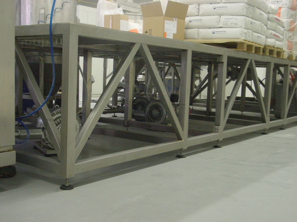 Nejnovější aplikací pneudopravy bylo zásobování surovinami dvou mísících strojů AMS. Pro řešení byla vybrána varianta se 4 dmychadly a 4 dávkovacími turnikety. Z důvodu úspory místa, bylo zvoleno prostorové uspořádání s jednou obslužnou plošinou, a to nejen pro přípravu surovin, ale i pro obsluhu obou AMS. Pod plošinou byly umístěny všechna dmychadla, tak aby nezabírala zbytečně prostor. S ohledem na maximální využívání objemu vsázky do AMS byly přehodnoceny velikosti násypek a výsypek. Všechny byly zvětšeny.